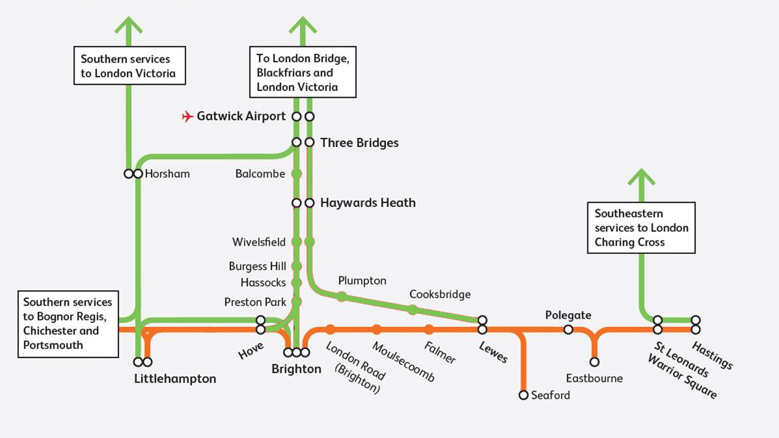 | Brighton / Seaford | Brighton – Lewes – Newhaven Town – (Newhaven Harbour) – Seaford | 2 | |